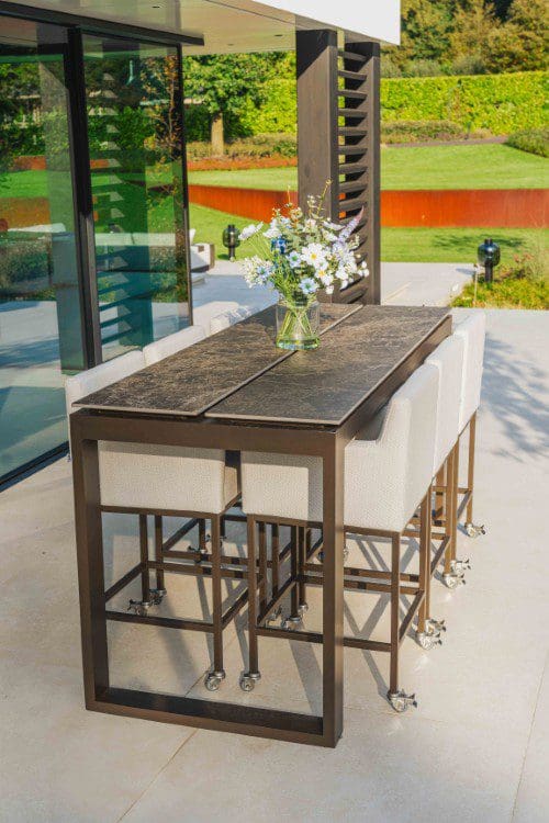 Our bar tables are available in more than 130 types of Italian and Spanish ceramics, with different structures such as wood, concrete and marble look. Designed to withstand the elements while maintaining a luxurious modern or more rustic look.